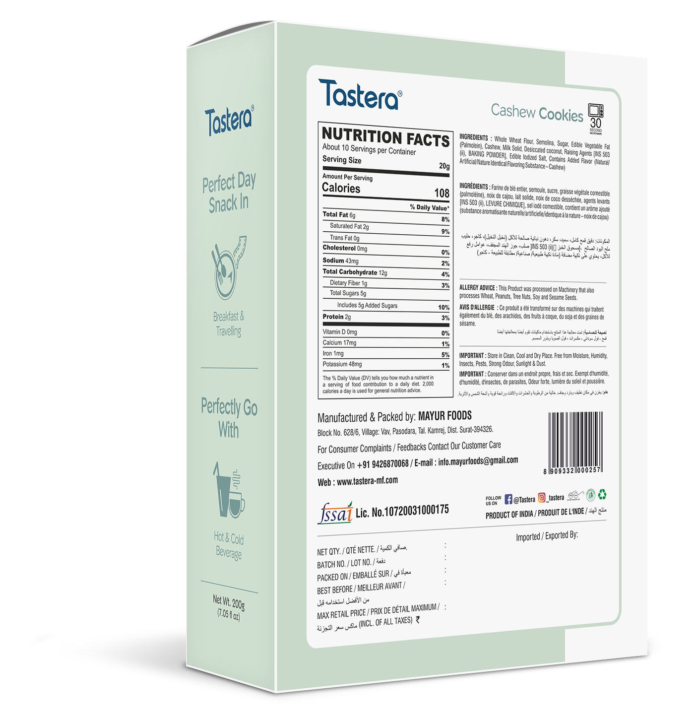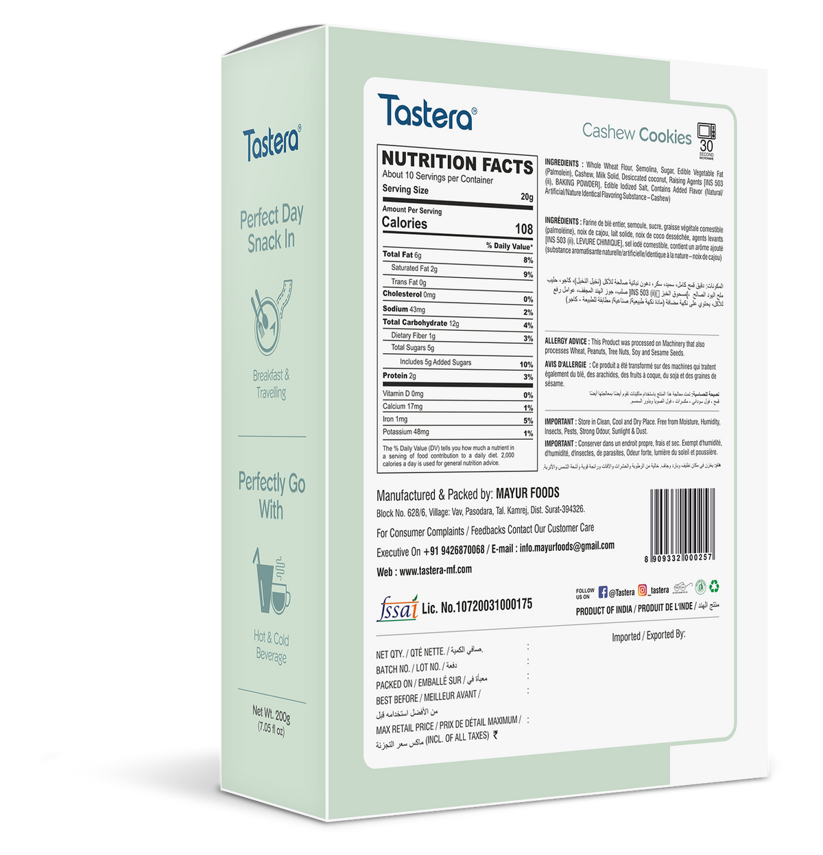 Savor the richness of our Cashew Cookies, made with 100% whole wheat flour and loaded with the buttery crunch of premium cashews. Each cookie is delicately crisp, mildly sweet, and packed with the nutty flavor of roasted cashews—offering a luxurious treat with every bite.
